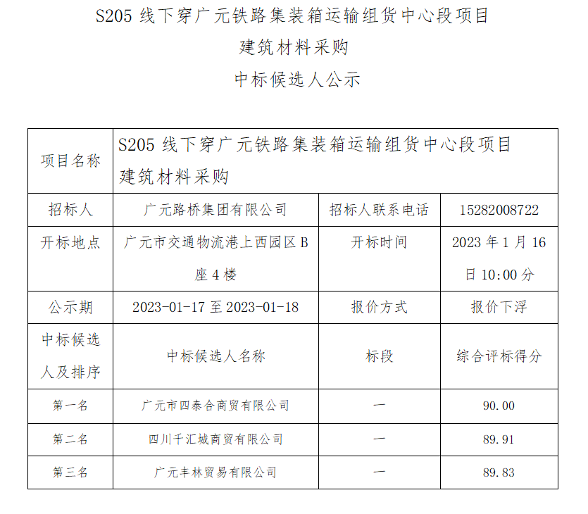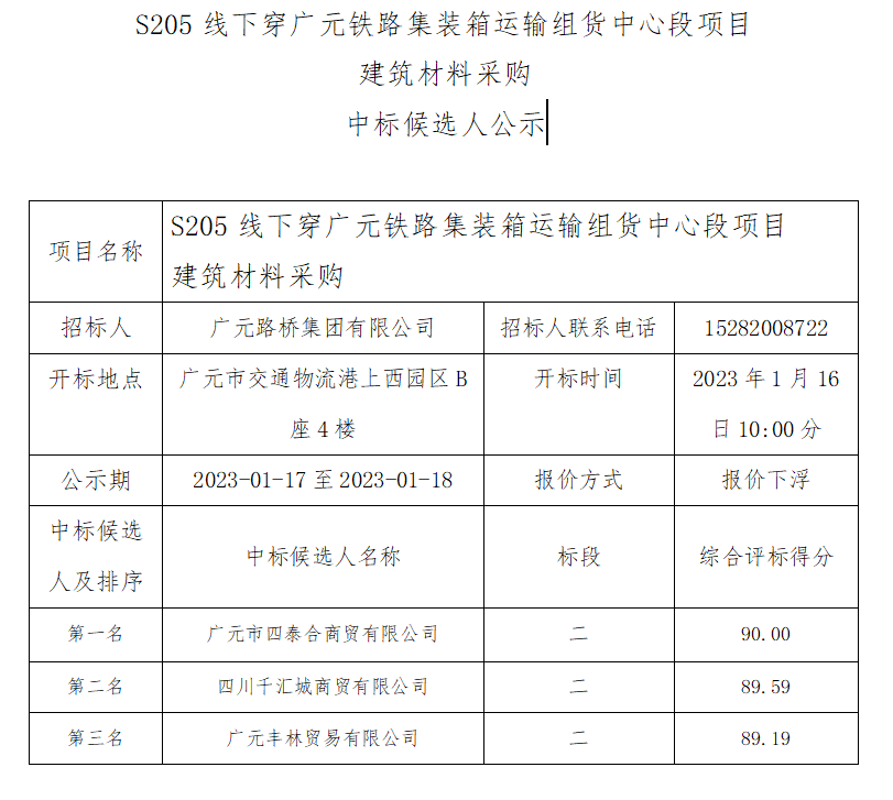 廣元路橋集團有限公司S205線下穿廣元鐵路集裝箱運輸 組貨中心段項目建筑材料采購中標候選人公示
